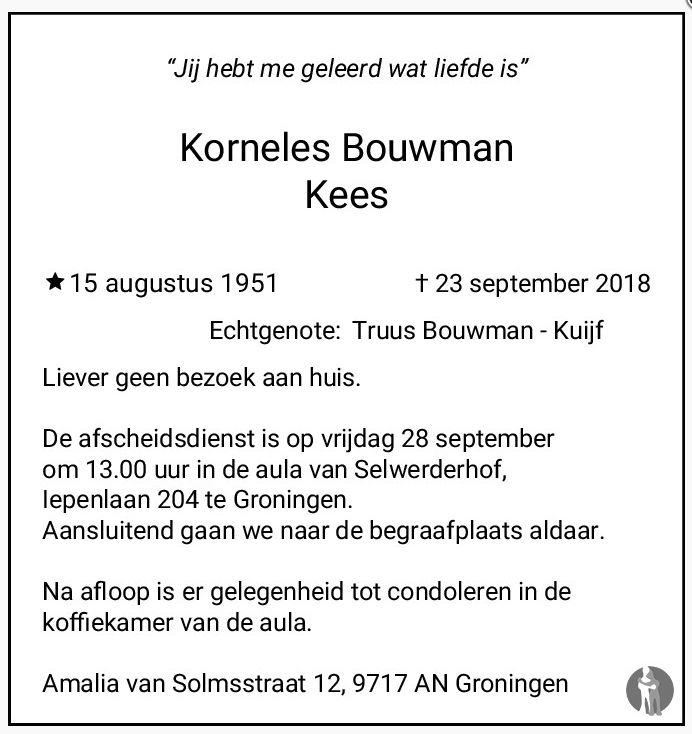 In de vroege ochtend van zondag 23 september 2018 is overleden, na een dramatische val van de trap, onze buurtgenoot Kees Bouwman. Kees was een gezellige buurtbewoner en altijd in voor een praatje. Hij had net het geluk gevonden en was kort geleden getrouwd met Truus. Vrijdag 28 september kunnen we afscheid nemen van Kees. In tegenstelling wat op de kaart staat zijn de straatbewoners welkom thuis bij Truus.